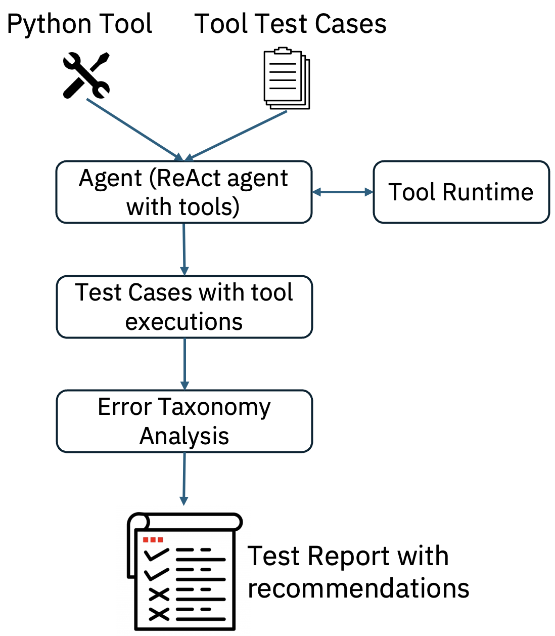 test_report: Tool test report with identified tool error taxonomy, recommendations for each test case (additionally tool execution logs can be added).